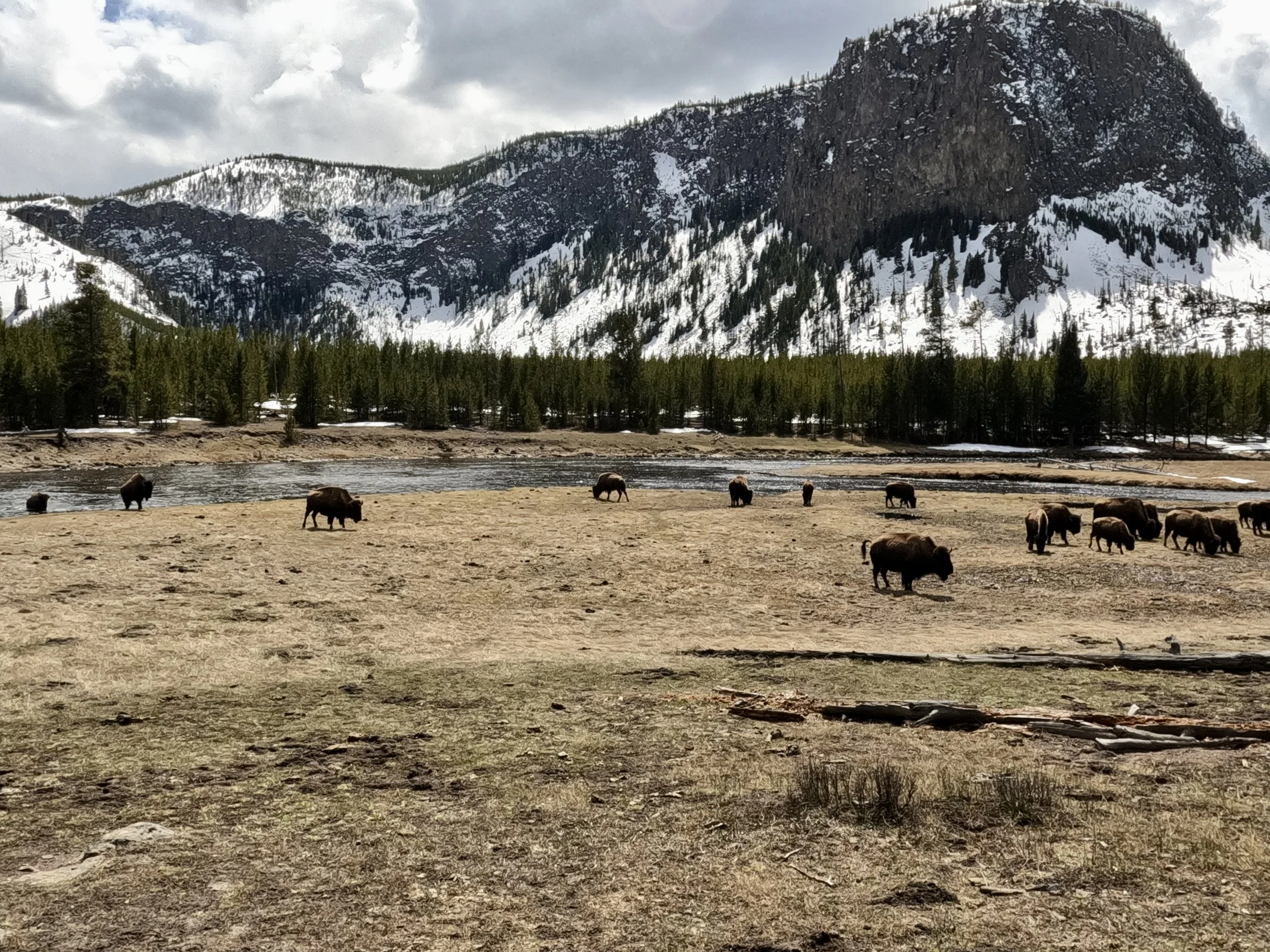 En route we encountered several herds of elk. Eventually we arrived at the north entrance to the park. The roads were hazardous due to snow and ice for the first few miles of driving, but eventually the snow dissipated and the weather warmed.
